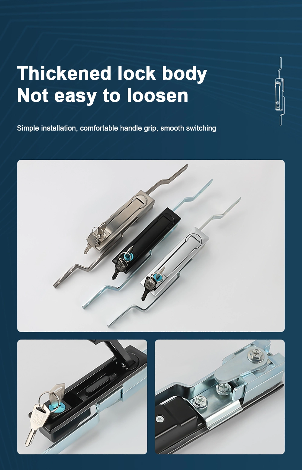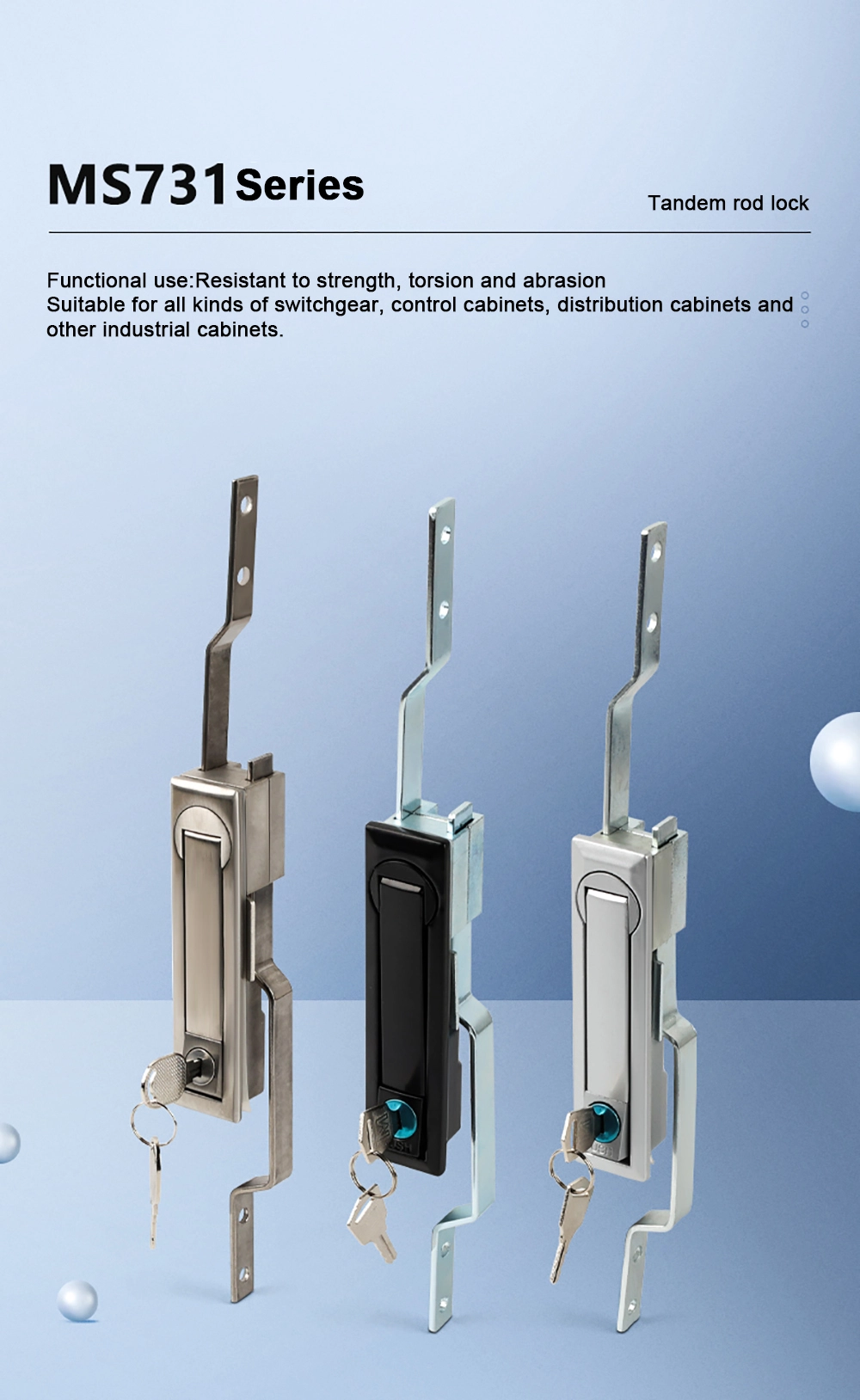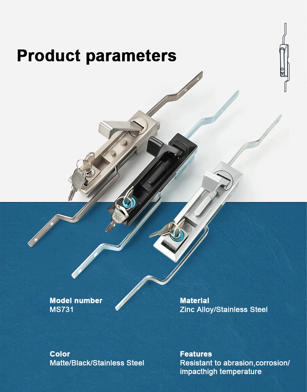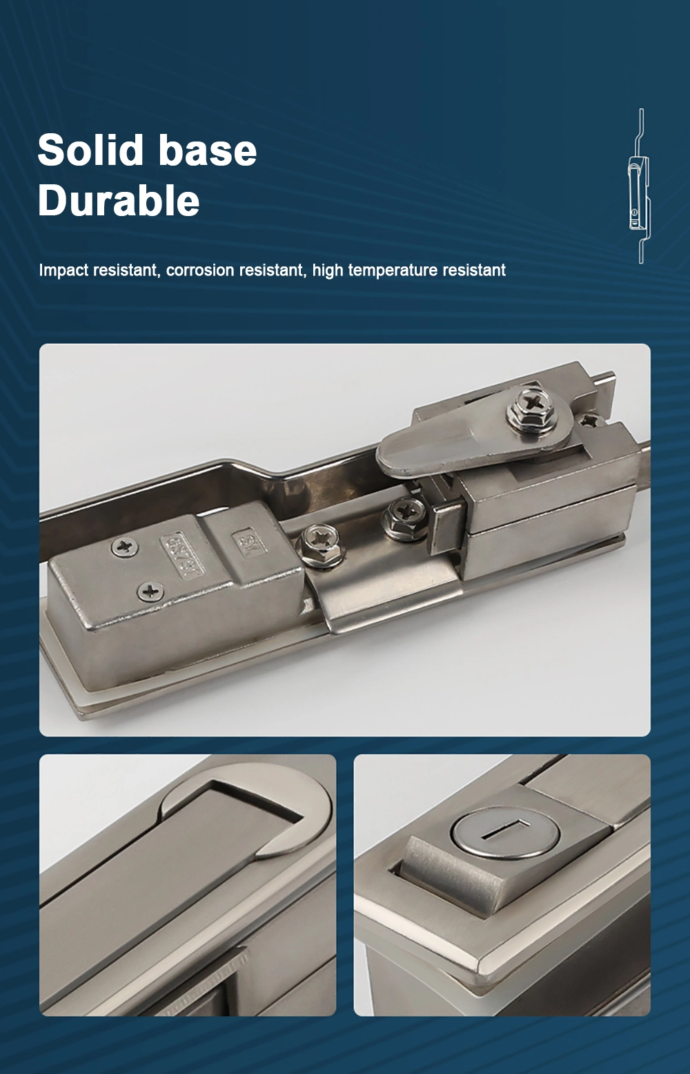 Soveltuu kaappeihin, viestintäasemille jne. Ruostumattomasta teräksestä valmistetut oven lukot ovat piileviä, pölynkestäviä ja vedenpitäviä.