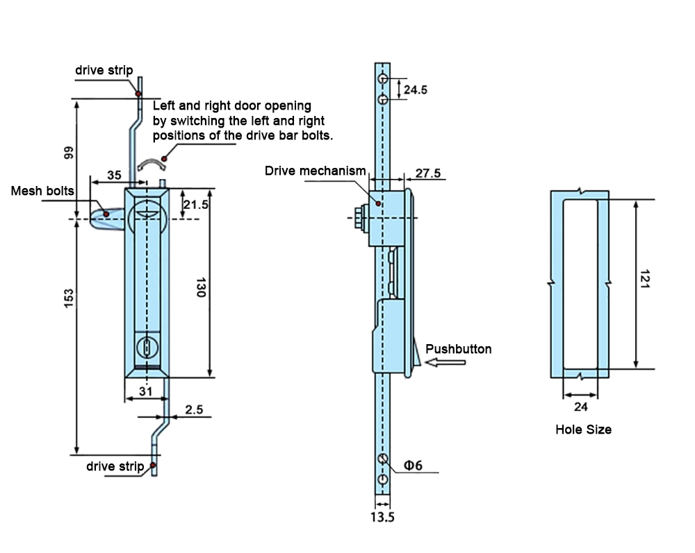 Ruostumattomasta teräksestä valmistettu oven lukko on valmistettu ruostumattomasta teräksestä alkuperäisessä ruostumattomasta teräksestä valmistetussa värissä kestävyyden ja korroosionkestävyyden vuoksi. Avauskoko on 24 mm × 121 mm, mikä varmistaa yhteensopivuuden tavanomaisten asennuskokoonpanojen kanssa.