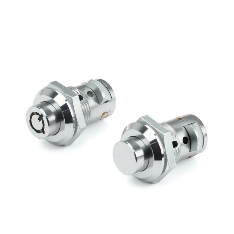 Painikemalli aukeaa automaattisesti, kun painiketta painetaan, ja lukittuu, kun ovi suljetaan, mikä tarjoaa perusturvasuojan. Tappilukkomallissa käytetään tappimekanismia, joka mahdollistaa pyörimisen vain vastaavalla avaimella, mikä tarjoaa varkaudenestotoiminnon. Molemmissa malleissa on sinkkiseosrakenne, joka tarjoaa tietyn tason lujuuden, ja niissä on lisätyt vedenpitävät tiivisteet lisää käytännöllisyyttä. Myyntiautomaattien sinkkiseossylinterilukko on korroosionkestävyyttä varten kirkkaalla kromipinnoitteella. Asennettujen ovipaneelien enimmäispaksuus on 10 mm. (Ruostumattomasta teräksestä valmistettujen materiaalien osalta ota yhteyttä. Valmistamme parhaillaan muotteja.)
