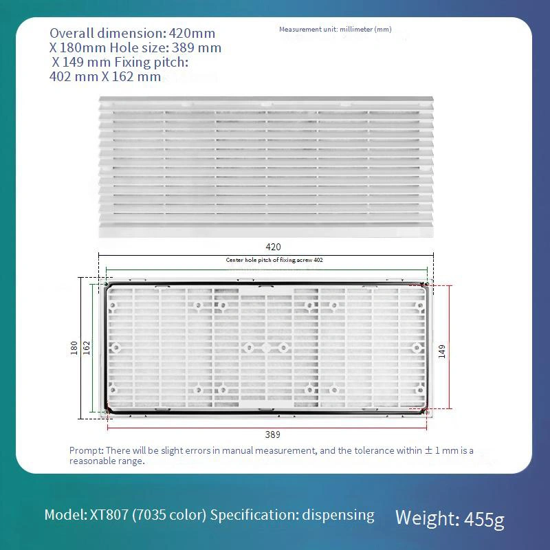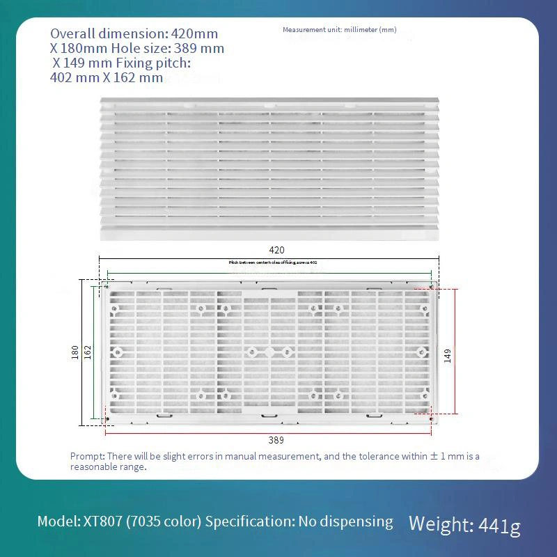 Ominaisuudet vaihdettava suodatinverkon suunnittelu päivittäisen ylläpidon ja korvaamisen helpottamiseksi, mikä vähentää merkittävästi pitkäaikaisia käyttökustannuksia. Kehysrakenne on saatavana vakiona valkoisen harmaan 7035 -värinä. Se on rakennettu ABS-materiaalista, joka tarjoaa erinomaisen muodonmuutosvastuksen, varmistaen pitkäaikaisen vakauden.